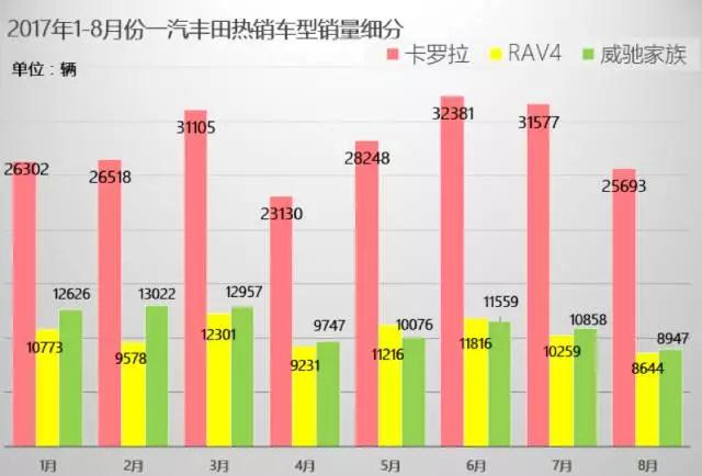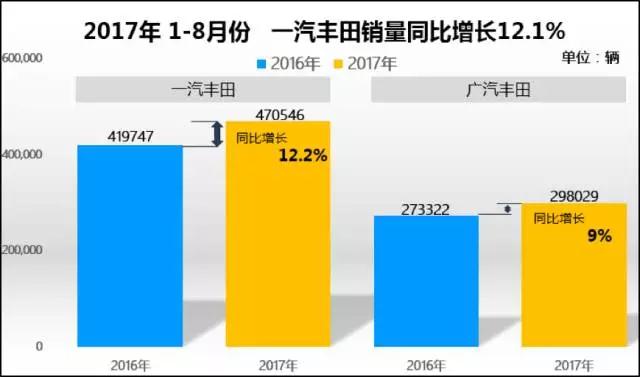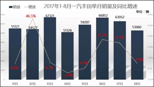 從上圖中我們不難看到從今年的1月份至8月份一汽豐田的銷量是處于一個(gè)比較穩(wěn)定的趨勢的,低的時(shí)候也有五萬多。與去年1-8月份的銷量對比,同比增速也是處于一個(gè)穩(wěn)扎穩(wěn)打的狀態(tài)。截止至8月份,一汽豐田今年累計(jì)銷量已經(jīng)達(dá)到47萬輛,對于全年67萬輛的銷售目標(biāo)已經(jīng)完成了70%,可以說達(dá)到目標(biāo)是輕而易舉的,剩下的銷量不成問題。