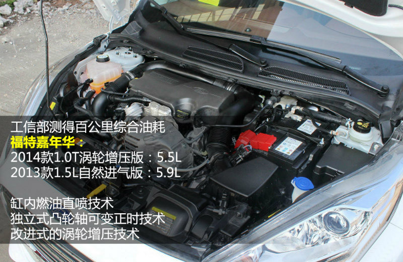 標配1.0T渦輪增壓動力引擎2014款福特嘉年華工信部測得百公里綜合油耗5.5L,而2013款1.5L自然進氣發(fā)動機嘉年華工信部給出的油耗數據為5.9L/100km??梢姡们也徽摴ば挪康挠秃臄祿卸嗥x實際情況,至少1.0T發(fā)動機油耗相對還是要比1.5L發(fā)動機低。具體原因主要有以下三點:缸內燃油直噴技術、獨立式凸輪軸可變正時技術、以及改進式的渦輪增壓技術。