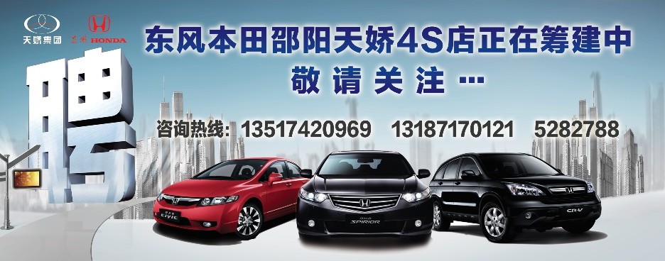 東風(fēng)本田邵陽(yáng)天嬌4S店主要以汽車(chē)銷(xiāo)售服務(wù)為主,目前對(duì)人才的需求包括:銷(xiāo)售、售后、財(cái)會(huì)、管理等相關(guān)人才。