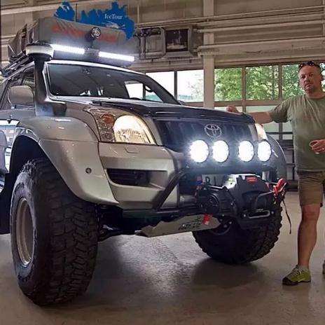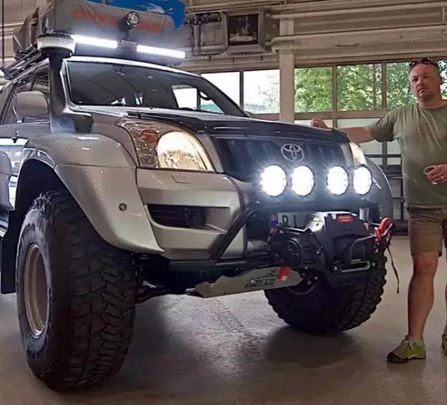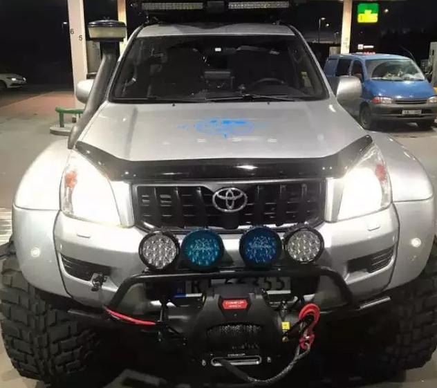 先來看看它的前臉,這輛普拉多應該是一輛低配的版本,連霧燈也沒有,所以車主改裝了一排4盞LED大燈在加裝的簡易防撞杠上,而進氣口為了不受水淹的影響,從翼子板開孔延長至A柱上。