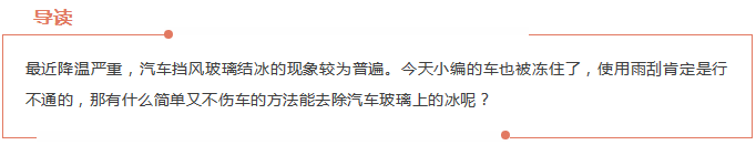 最好的方法是啟動(dòng)車子,當(dāng)發(fā)動(dòng)機(jī)水溫上升后,用暖風(fēng)吹風(fēng)擋玻璃,直到冰層融化。但這種方法也有一定的弊端,就是費(fèi)時(shí)、費(fèi)力、費(fèi)油。假如在收車后不再下雨雪,可將擋風(fēng)玻璃上的水擦拭干凈,這樣也可避免擋風(fēng)玻璃上再次結(jié)冰。假如是下雪的時(shí)候,在收車后可將擋風(fēng)玻璃擦拭干凈,然后在擋風(fēng)玻璃上籠蓋上一層報(bào)紙,這樣再出車時(shí)將報(bào)紙撕去即可,不用再擔(dān)心擋風(fēng)玻璃結(jié)冰了。